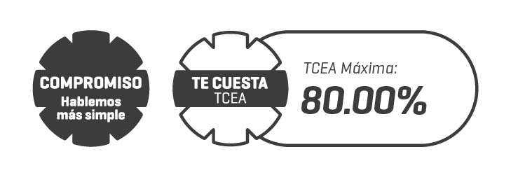 Ejemplo: TCEA máxima referencial calculada con una TEA referencial de 80.00%. Por desembolsos de S/ 5,000 a un plazo de 12 meses, pagando cuotas aproximadas de S/564.77, tendrá un total de intereses de S/ 1777.23, no se considera Seguro de Desgravamen, puede ser solicitado de manera opcional , en el caso de contratar el Seguro de Desgravamen y en la medida que la tarjeta tenga movimientos y/o saldo deudor se cobrará una prima mensual variable de Seguro de Desgravamen, aplicando una tasa de 3.00% calculada sobre el saldo deudor capital promedio diario del ciclo de facturación, con un máximo mensual de S/19.90. Se considera envío de Estado de Cuenta virtual sin costo y una comisión por uso del canal de 3.99% del monto desembolsado (mín.: S/ 14.90 – máx.: S/ 49.90). Tasa de interés moratorio aplicable según tarifario vigente. Factor de amortización: 24 meses. Año: 360 días. Sujeto al ITF 0.005%.